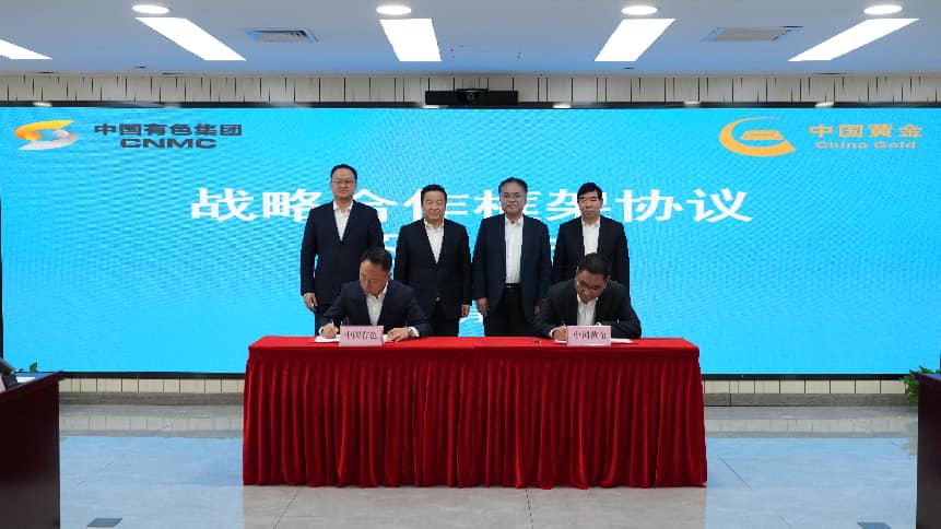 2月10日,中國有色礦業集團有限公司(簡稱:中國有色集團)與中國黃金集團有限公司(簡稱:中國黃金集團)簽署全面深化戰略合作框架協議。中國黃金集團黨委書記、董事長周洲,中國有色集團黨委書記、董事長文崗,黨委委員、副總經理劉宇,中國黃金集團建設有限公司黨委書記、董事長高延龍現場見證簽約。中國黃金集團副總經理王佐滿,中國有色集團黨委委員、副總經理王焱代表雙方簽約。